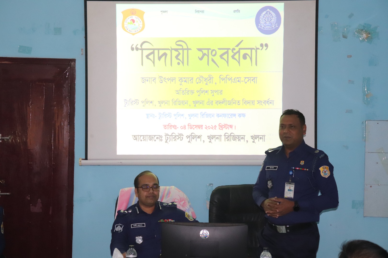 দ্য ০৪ ডিসেম্বর ২০২৫ খ্রি: ট‍্যুরিস্ট পুলিশ, খুলনা রিজিয়নের জনাব উৎপল কুমার চৌধুরী, অতিরিক্ত পুলিশ সুপার এঁর ট্যুরিস্ট পুলিশ, সিলেট রিজিয়নে বদলী হওয়ায় বদলিজনিত বিদায় সম্বর্ধনা অনুষ্ঠিত হয়েছে। উক্ত বদলীজনিত বিদায় অনুষ্ঠানে সভাপতি হিসেবে উপস্থিত ছিলেন জনাব মুহাম্মদ আলী হোসেন, পুলিশ সুপার (অতিঃ ডিআইজি পদে পদোন্নতি প্রাপ্ত), ট্যুরিস্ট পুলিশ, খুলনা রিজিয়ন। এছাড়াও উক্ত অনুষ্ঠানে উপস্থিত ছিলেন ভার্চুয়ালি জোনসমূহের ইনচার্জ ও ফোর্স এবং স্ব-শরীরে উপস্থিত ছিলেন রিজিয়নের অফিসার ও ফোর্সবৃন্দ। বিদায় সম্বর্ধনা অনুষ্ঠানের সম্মানিত সভাপতি মহোদয় বিদায়ী অতিথির ভবিষ্যৎ কর্মজীবনের উত্তরোত্তর সাফল্য ও সর্বাঙ্গীণ মঙ্গল কামনা করেন।