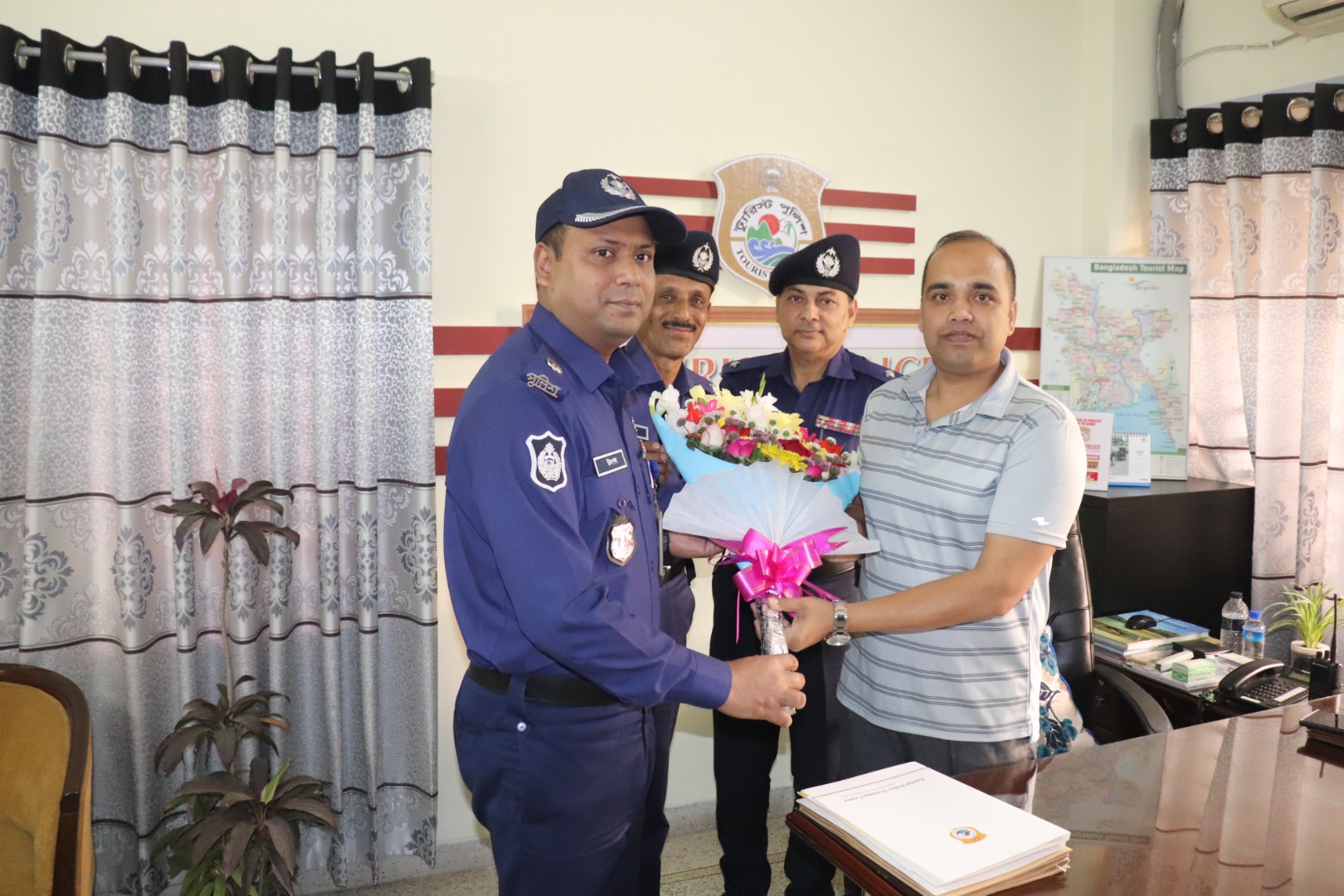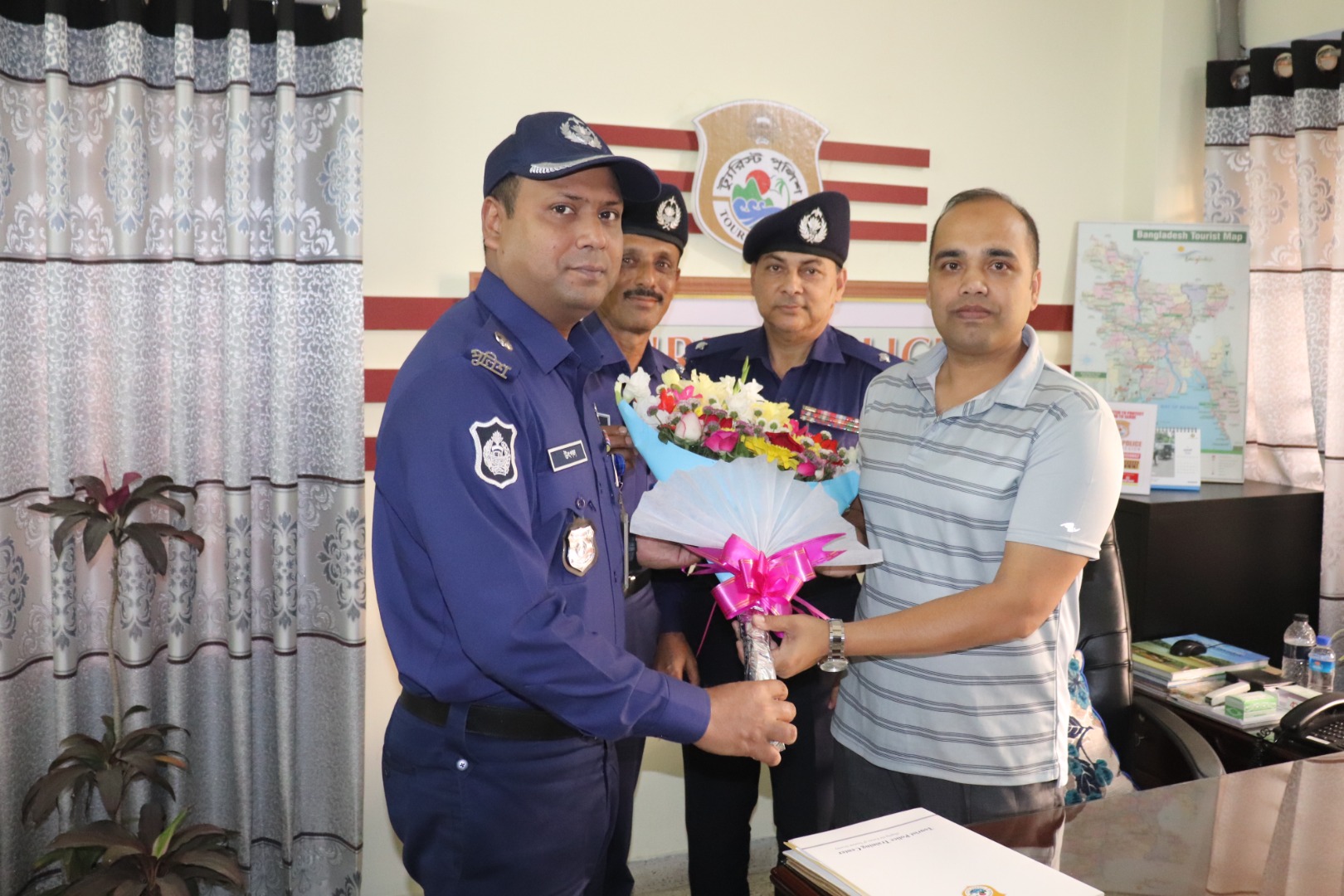 ট্যুরিস্ট পুলিশ, খুলনা রিজিয়নে যোগদানকৃত পুলিশ সুপার (অতিরিক্ত ডিআইজি পদে পদোন্নতি প্রাপ্ত) জনাব মুহাম্মদ আলী হোসেন স্যারকে খুলনা রিজিয়নের অতিরিক্ত পুলিশ সুপার, জনাব উৎপল কুমার চৌধুরী, পিপিএম-সেবা এবং অন্যান্য সকল অফিসার ফোর্সের পক্ষ থেকে ফুল দিয়ে শুভেচ্ছা জানানো হয়।
